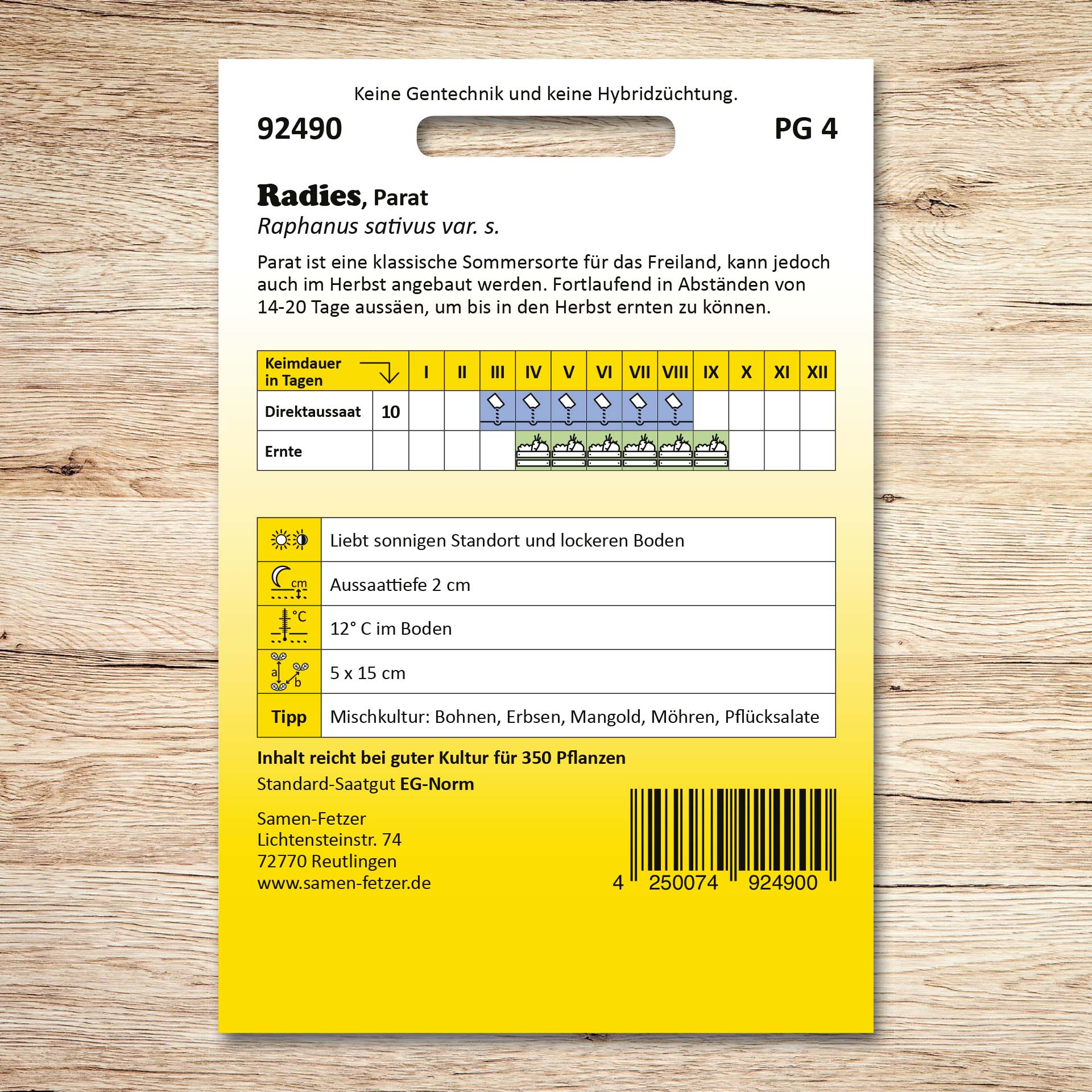 | Aussaat: | März, April, Mai, Juni, Juli, August |